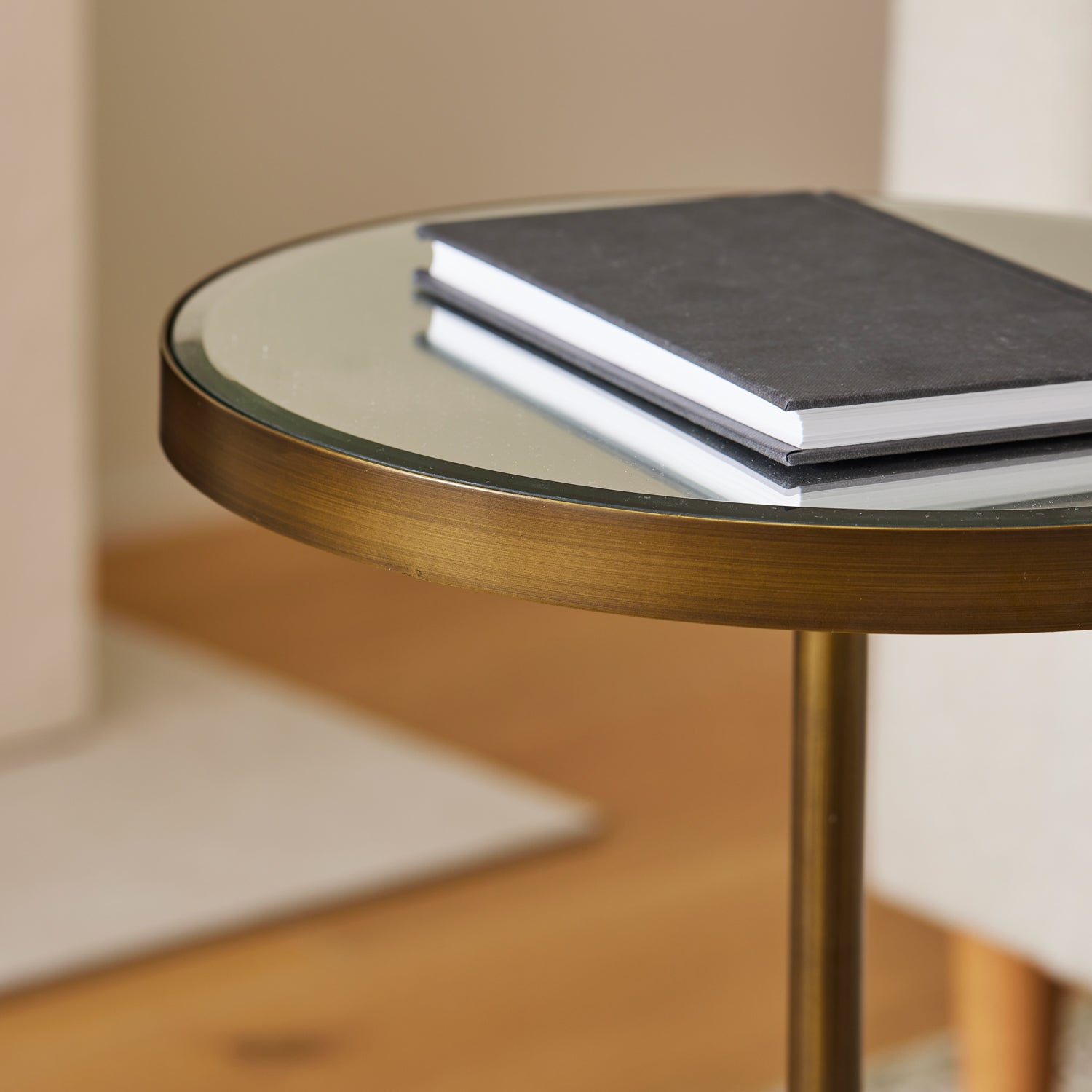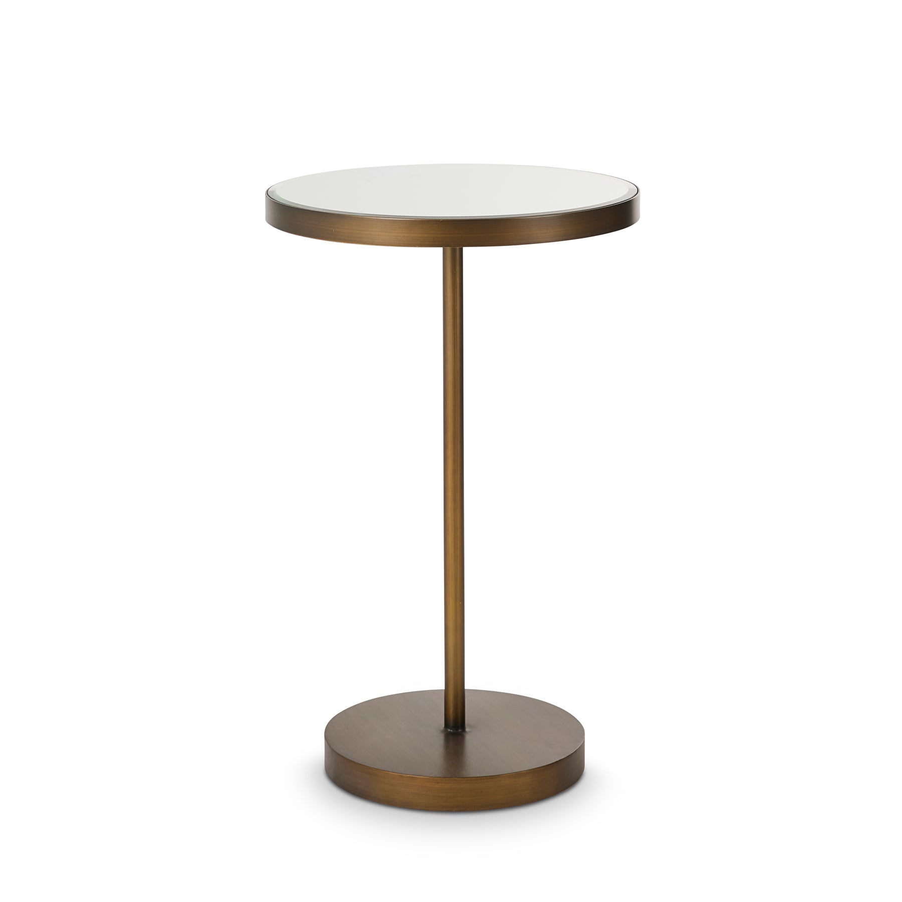 The Lawrence Cocktail Table combines sleek design with a touch of glamour. Featuring a round mirrored top framed in antique-look metal, it sits on a slim pedestal base with a circular foot for balance and style. Perfect for holding drinks, a lamp, or decorative accents, this compact table adds a modern yet timeless elegance to any living space.